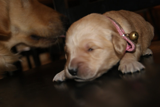 | Yesterday I documented the first three puppies to go. This past Saturday was busy with four puppy owners coming. Here is Pink/brown collar, named Fiona. |